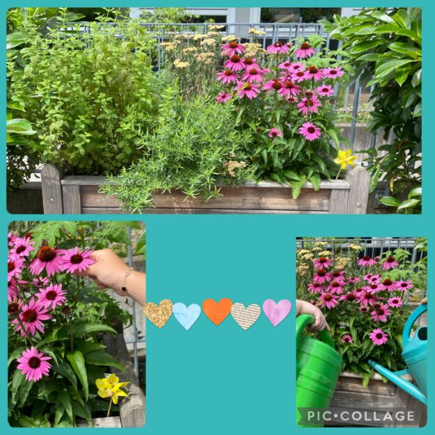Wir verschönern unseren Schulhof Kinder der vierten Klassen, haben zwei Hochbeete bepflanzt und pflegen sie liebevoll Von Rosmarin, Minze und Estragon, über Tomate und prächtig blühende Blumen. Ein kleines Paradies!